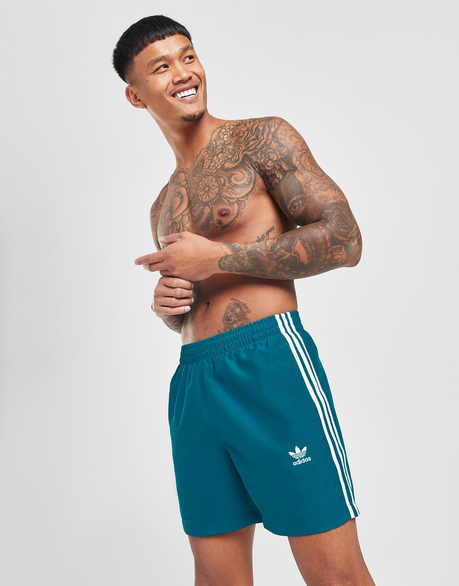 Підготуйся до відпустки з чоловічими плавками California від adidas Originals. У кольорі Active Teal, ці шорти виготовлені з переробленої поліестерової тканини, що швидко висихає, із дихаючою сітчастою підкладкою для прохолоди й комфорту. Мають еластичний пояс і шнурок для надійної посадки, а також кишені з боків і ззаду для зберігання речей біля басейну. Завершує образ контрастний білий логотип Trefoil і фірмові 3-Stripes. Можна прати в пральній машині. | Зріст моделі — 183 см, розмір M.